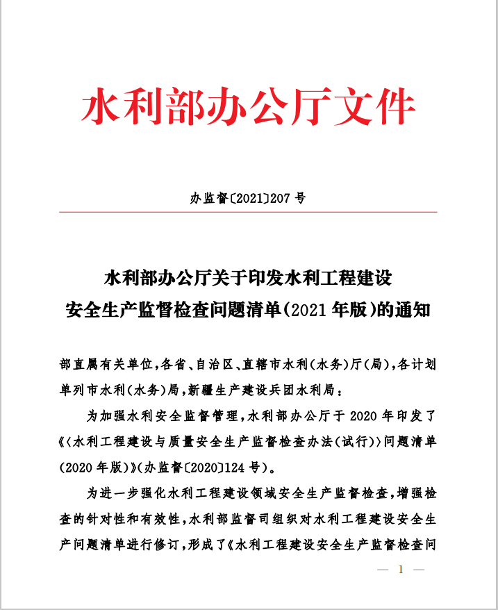 关于印发水利工程建设安全生产监督检查问题清单(2021年版)的通知